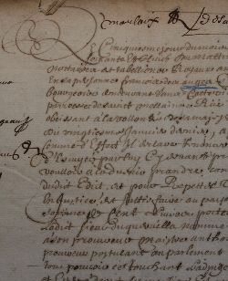 Le cinquiesme jour du mois d’octobre mil six cent soixante et huict du mattin, par devant nous nottaires et tabellions royaux à Morlaix, a comparu en sa personne François des Anges, sr du Quervella, bourgeois demeurant dans cette ville de Morlaix, parroisse de Sainct-Mellainne, rue du Quay, lequel obéissant à la vollonté de Sa Majesté et à son édict du vingtiesme janvier dernier, à par cette déclaration, comme d’effect il déclare renoncer à la quallitté d’escuyer par lui cy devant prinse, et ne la voulloir à l’advenir prandre contre ny au préjudice dudit édict, et pour repetter tout ce que dessus en justice, et sattisfaire en payemenent de la somme de cent livres portés par ledt édict.