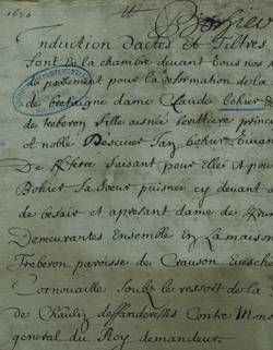 Voilà la maison dont les deffenderesses font voir estre sorties et en explicquant ce mot de Ꝃbohier, les bretons sçavent qu’il veut dire la maison de Bohier ou Ville Bohier, partant elles ont raison de dire qu’elles sont issues d’une maison dont elles portent le mesme nom et qu’elles ont un bon principe, et pour justiffier le tout,