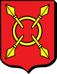 De gueules à quatre pointes de dards posés en sautoir et passées dans un anneau en abîme, le tout d’or.